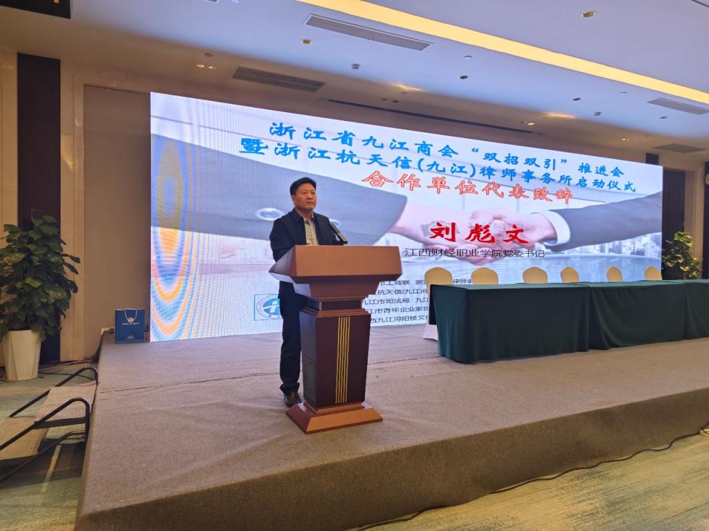 刘彪文在致辞中首先对九江商会“双招双引”推进会和浙江杭天信(九江)律师事务所启动仪式的成功举办表示热烈祝贺。他指出,市场经济就是法治经济,经济越发达,对于法律的呼唤越强烈。他引经据典,谈了对法律的认识:“何为法?法如水度公平,法如镜辨是非,法如绳量曲直”“何为律,律是规则、标准,律是节奏、尺度,律是号令、约束”“何为师?师者,授人以知以识,教人以道以德,树人以本以魂”。刘彪文表示,法律工作者,同时也是教育者。紧盯国家战略,服务地方经济社会发展,培养优秀的基层法律工作者,是学校的使命、职责和担当。要实现中国式现代化,首要的要求是经济现代化,重要保障是法律现代化,“奉法者强则国强,奉法者弱则国弱”“令在必信,法在必行”“有法而无志其义,则渠渠然;依乎法而又深其类,然后温温然”。最后,他强调,围绕国家第二个百年奋斗目标,实现九江打造“三个区域中心”建设“一个美好家园”的宏伟蓝图,推进九江经济现代化,是九江法律界、商界和教育界共同的使命和职责。我校与杭天信(九江)律师事务所的深度融合,将为九江的再度辉煌贡献力量。
