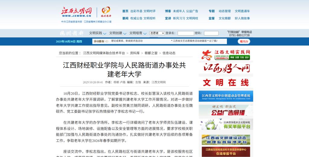(江西文明网)江西财经职业学院与人民路街道办事处共建老年大学