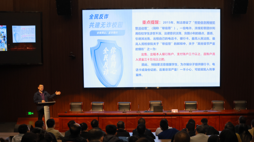 为进一步筑牢校园安全防线,提升辅导员及学生管理工作人员的安全管理能力与反诈宣教水平,4月1日下午16:20,我校在八里湖校区行政楼二号报告厅举行辅导员安全稳定工作专题培训。全体辅导员、各二级学院党总支书记和学生管理工作人员参加,培训由党委委员刘锋主讲。培训会上,刘锋围绕校园安全稳定工作的形势与任务,分析了校园安全工作的风险点,重点结合我校2025年电信网络诈骗案件的具体数据与典型案例,深入分析了刷单返利、...
