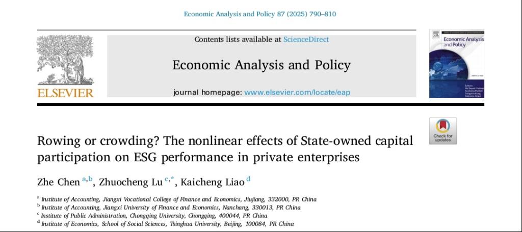 近期,会计学院党员青年教师陈哲博士作为第一作者的合作论文“Rowing or crowding? The nonlinear effects of State-owned capital participation on ESG performance in private enterprises”被经济学国际高水平期刊Economic Analysis and Policy接收并正式发表。 Economic Analysis and Policy是JCR一区、中科院二区TOP期刊,在Economics学科类别的排名为11/597,2024年的影响因子为8.7。陈哲博士是该论文的第一作者,且我校是该论文的第一署名单位。
