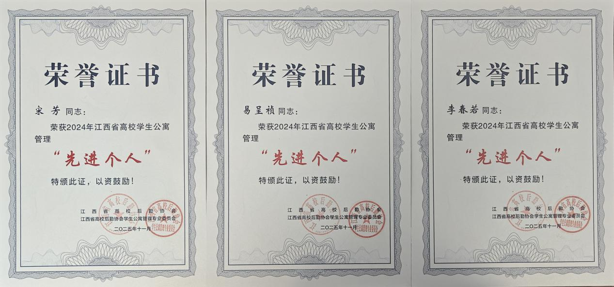 2024年度,我校荣获“2024年度江西省高校学生公寓管理先进单位”称号,宋芳、易呈祯、李春若三位同志荣获“2024年度江西省高校学生公寓管理先进个人”称号。