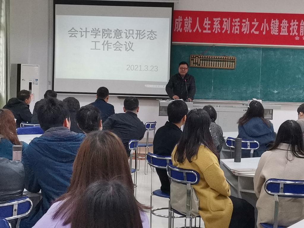 为进一步加强和改进意识形态工作,全面提升意识形态工作水平,2021年3月23日下午,会计学院在东区实训室召开意识形态工作暨宣传思想工作会议。党总支书记张家顺主持会议并讲话,全体教职工参加了会议。
