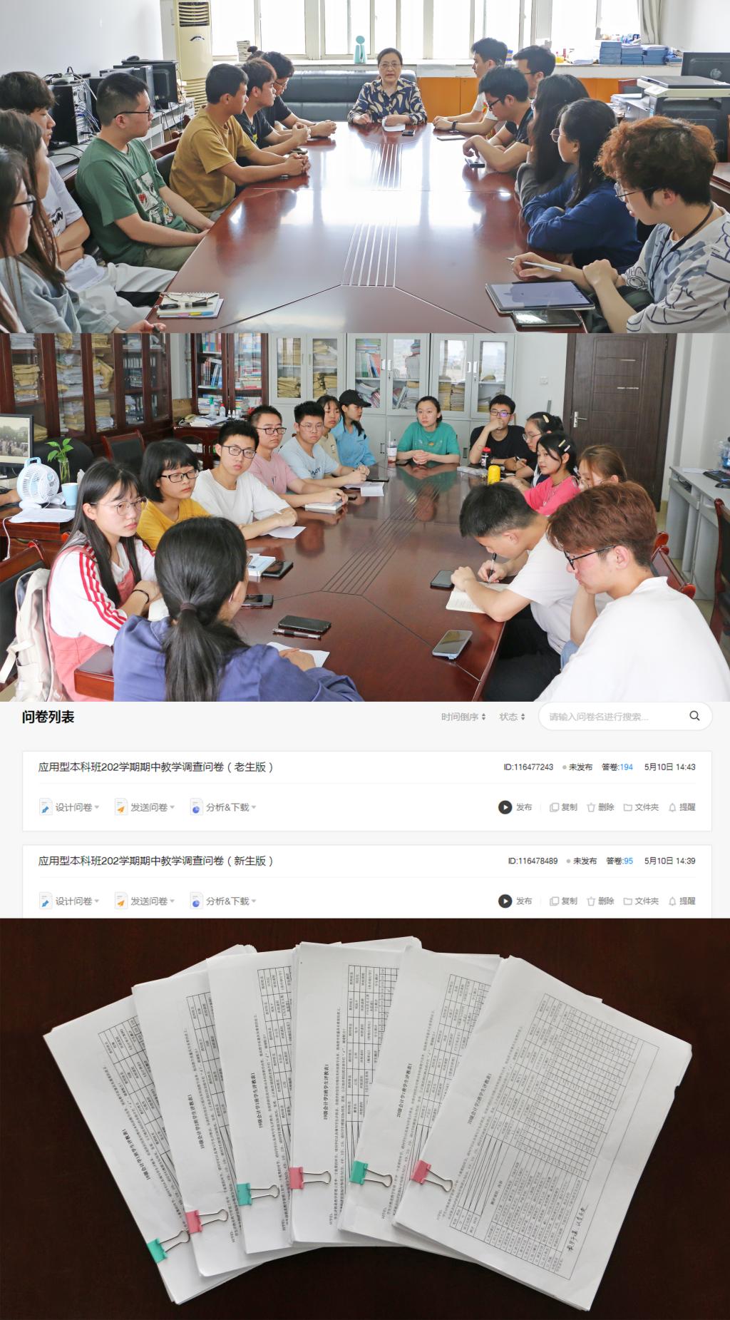为了获得学生对于教学质量、教学模式及教学管理等方面的真实反馈,本科部开展了匿名网络问卷调查以及评教活动,这是最能直观展示学生想法的平台,学生通过问卷和评教,将相关建议和诉求客观呈现,本科部会同相关部门及老师进行沟通协商,“对症下药”,也为后续学生座谈会开展做足准备。为进一步贯彻落实“我为群众办实事”精神,以面对面的方式更为高效地听取学生心声,2021年5月13日14:30-15:30、5月14日16:30—17:30,本科部在综合楼915分别组织召开了18级、19和20级本科生期中教学座谈会,18、19、20级共计40名学生代表及部分本科部老师共同参加了此次活动。座谈会分两个环节:第一环节,由本科部主任梁瑞红就学生前期在教学内容、课程设置、教学安排、教学特点等方面提出的困惑、建议及有关解决结果做了相对应的反馈。第二环节,由各班学生代表依次提出在以上共性问题之外的关于学习等方面仍存在的问题,本科部老师积极回应,为同学们解答疑惑并提出了具体合理的解决方案。最后,梁瑞红主任鼓励同学们要养成良好的学习习惯、生活习惯、学习方法,督促同学们要积极主动学习,并请在座的各班学习委员把座谈会上的内容和思想及时准确地传达给班上同学。会议结束后,梁瑞红主任还与三个年级少数同学谈心谈话,温馨警示少数同学课程成绩未达到毕业条件,激励他们刻苦学习,报答父母的养育。