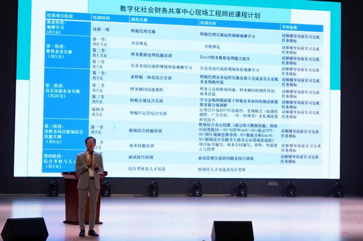 讲座伊始会计学院副院长谭玉林发表动员讲话。他从“宏观形势+学院实践”双维度展开,首先分析当前会计行业发展态势:随着数智化转型加速,传统财务岗位需求结构调整,“财税一体化”“智能财务运维”等新型岗位缺口扩大,既为毕业生带来挑战,更提供了转型机遇。