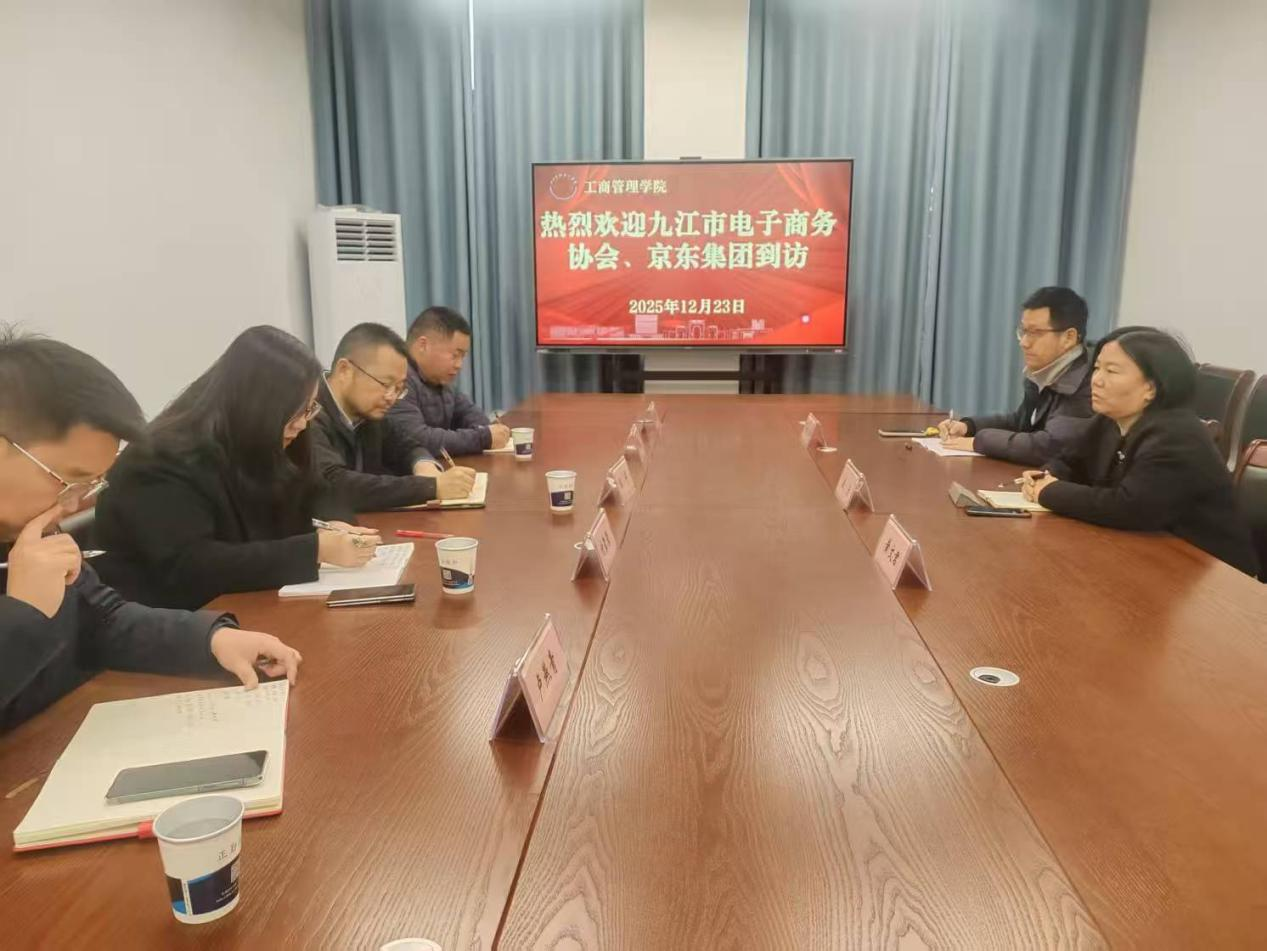 2025年12月23日,九江市电子商务协会会长付莹莹与京东集团代表一行来访我校工商管理学院,双方就深化校企合作、共育电商人才进行了深入交流与洽谈。工商管理学院党总支书记武丹、市场营销教研室主任钟思参加了本次交流会。