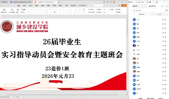 为强化毕业生岗位实习工作指导,引导学生提升安全意识、保障实习质量,2026年元月上旬,城乡建设学院组织召开了2026届毕业生岗位实习动员暨安全教育专题会议,会议由学院实习工作负责人吕亨龙主持,全体毕业班实习指导教师及班主任参会。吕亨龙围绕学校实习工作安排,就实习的课程安排、管理制度、考核要求等作了详细说明,会议特别强调了实习期间的安全应急处置要求,明确了实习指导老师和班主任要帮助26届毕业生就实习期间可能遇到的心理问题及应对方法进行及时指导,鼓励同学们积极面对岗位工作。