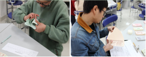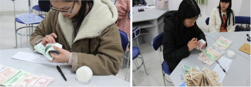 比赛采用定时清点的规则,要求参赛选手在5分钟时间内依次完成对壹角、贰角、伍角、壹元、贰元、伍元、拾元、贰拾元、伍拾元和一佰元共十种不同面值且不同数量的练功券的清点,全面地考核同学们点钞的速度与准确性。比赛中,“刷刷”的点钞声清脆悦耳,富有节奏,给现场带来了别样的气氛。参赛选手们屏息凝神,坐姿端正,手法娴熟,动作灵敏,广泛采用规范的单指单张、单指多张、多指多张等点钞手法完成比赛,展示了良好的专业素养和过硬的心理素质。