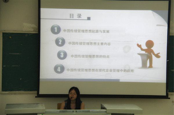 讲座为“赢在商战”第一季系列活动的重要内容之一,由工商管理学院王金梅副教授主讲。王老师从中国传统管理思想的起源与发展谈起,介绍了中国传统管理思想的主要内容及其特点,重点阐述了中国传统管理思想在现代企业管理中的应用。王老师的讲座,由浅入深,理论联系实际,案例丰富,讲解生动活泼,使在场师生深刻体会到了中国文化及传统管理思想的博大精深。