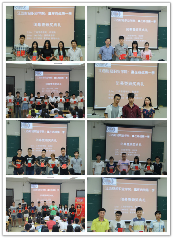 讲座后隆重举行了“赢在商战”第一季闭幕式暨表彰大会。“赢在商战”第一季企业经营管理沙盘赛项中,“友谊的小船团队”(黄细凤、王磊、邹茜蕾、葛涛、徐嘉琪)、“阿甘团队”(吴明活、冯青、段德亮、张凯、王彬议)分别获得初级组与高级组一等奖;“愤怒的蜗牛团队”(周洪、胡金、杨文丽、何雪娟)则摘得了营销风采秀赛项的桂冠。出席大会的领导和嘉宾分别给各项赛事一等奖、二等奖、三等奖团队颁发了证书和奖金。