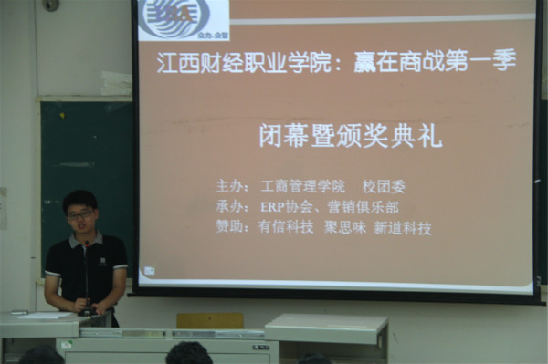 6月15日下午,工商管理学院在综合楼阶梯教室二举办了以《中国传统管理思想与现代企业管理》为主题的讲座,并于讲座后隆重举行了“赢在商战”第一季闭幕式暨表彰大会。出席大会的领导和嘉宾有我校教务处处长程文忠教授、九江友信科技公司王超经理、江西用友新道公司卢燕青经理、九江聚思味公司郭凌云主管、校团委青工书记叶睿老师、工商管理学院党政班子等。