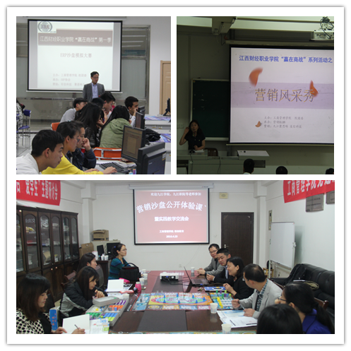 “赢在商战”第一季系列活动由工商管理学院和校团委联合主办,ERP协会与市场营销俱乐部具体承办。活动主要由企业经营管理沙盘大赛、营销风采秀等两个专业技能赛项和交流.论坛等项目组成。在历时两个多月的活动期间,两个专业技能赛项共吸引了来自工商管理学院、会计第一、二学院、经贸学院、本科部等院系500余名学生参加。交流.论坛项目举办了来自企业负责人、本院教师主讲的两场专题讲座,成功组织了九江学院电商学院、九江职业大学经营学院等院校市场营销专业教师参加的营销模拟沙盘公开体验课暨实践教学交流会。