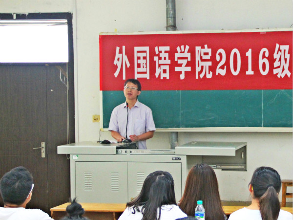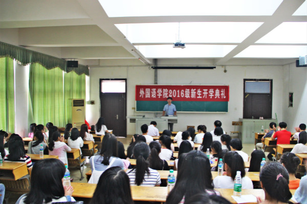 9月5日上午,外国语学院在综合楼阶梯教室(一)举行2016级新生开学典礼。外国语学院院长王胜华、党总支书记何平滚、党政办公室主任欧阳倍祥、商务英语教研室主任李辉及新生班主任业方琼和叶吟桐参加典礼。典礼由欧阳倍祥主持。