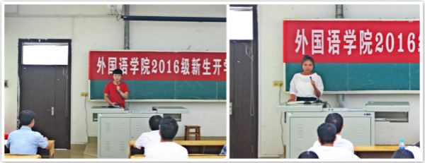 外国语学院学生会主席程进军和新生代表2016级商务英语2班田小凤分别作了发言。