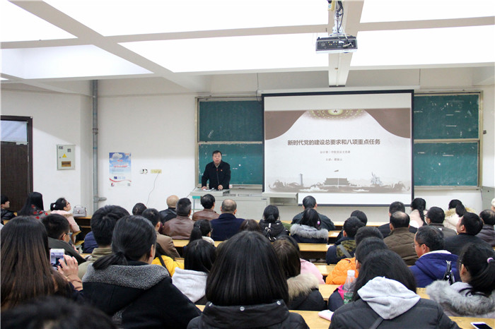 党总支书记谭国云作了题为《新时代党的建设总要求和八项重点任务》的专题学习讲座。讲座围绕学习宣传贯彻十九大精神政治任务,就如何理解与实现新时代党的建设总要求,坚持和加强党的全面领导,坚持党要管党、全面从严治党,不断提高党的执政能力和领导水平等方面内容进行了系统的阐述,逐层讲解了党的建设的主题、主线、统领、根基、着力点、党的建设六大方面和目标等七个方面内容,详细讲解了八项重点任务,着重强调把党的政治建设摆在首位,用习近平新时代中国特色社会主义思想武装全党。实现伟大梦想,必须推进伟大斗争,必须建设伟大工程,必须推进伟大事业,其中起决定作用的是党的建设新的伟大工程。