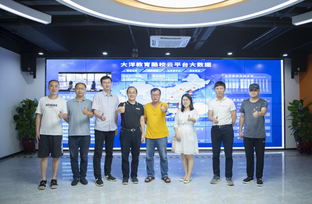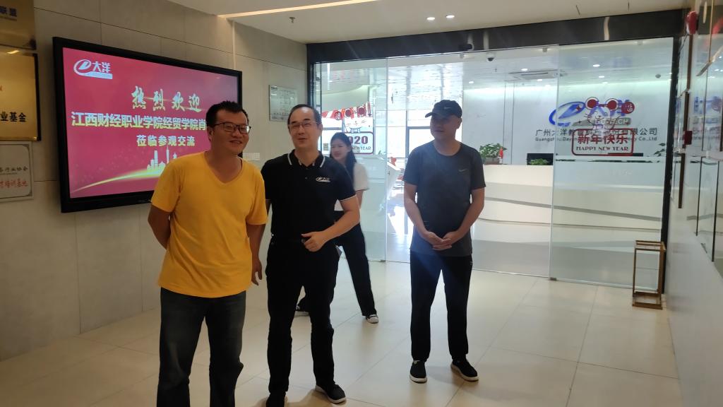 考察团在跨境教育龙头企业广州大洋教育股份有限公司会议室与番禺职业技术学院跨境电商负责人邓志超主任的座谈交流中,深入学习番禺职院跨境电商专业在校企合作模式、产业学院、1+X证书等方面的先进经验。同时大洋教育股份有限公司董事长周春翔介绍了公司在跨境电商教育方面一站式解决方案以及相关产品展示。