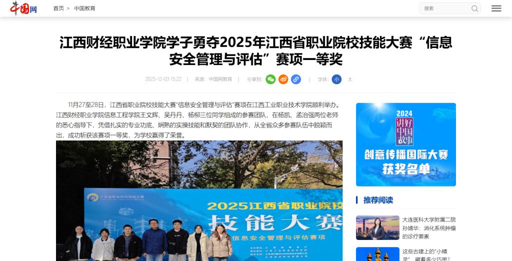 (中国网)江西财经职业学院学子勇夺2025年江西省职业院校技能大赛“信息安全管理与评估”赛项一等奖