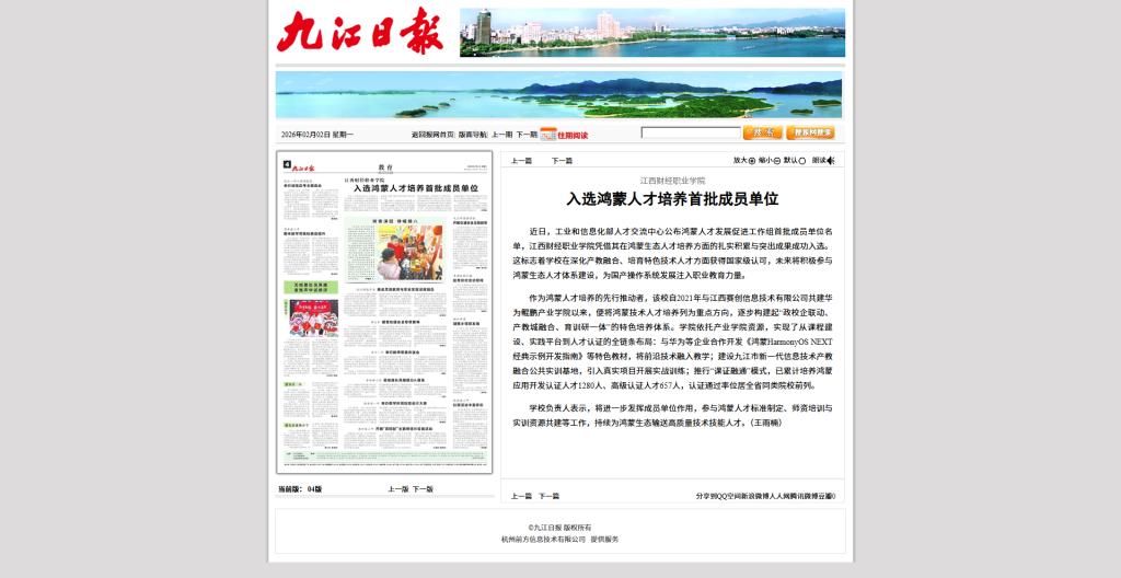 (九江日报)江西财经职业学院 入选鸿蒙人才培养首批成员单位
