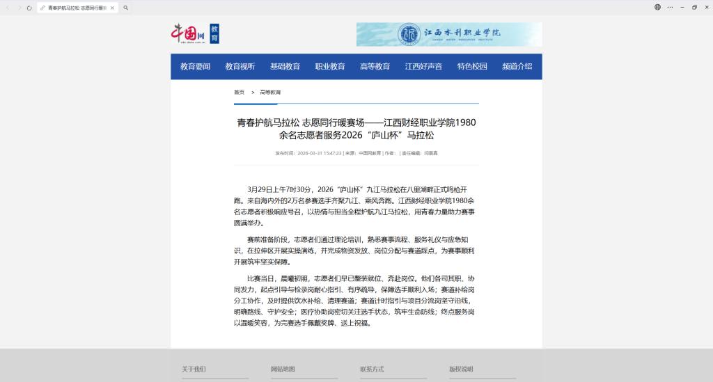 (中国网)青春护航马拉松 志愿同行暖赛场——江西财经职业学院1980余名志愿者服务2026“庐山杯”马拉松