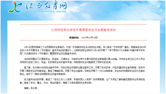 4月18日,江西教育网报道了我校开展国家安全日主题宣传活动。